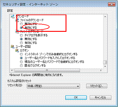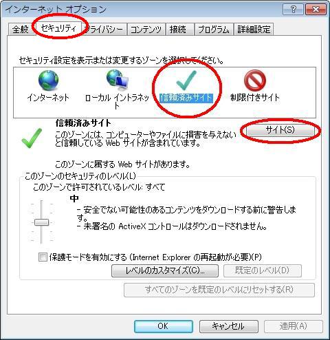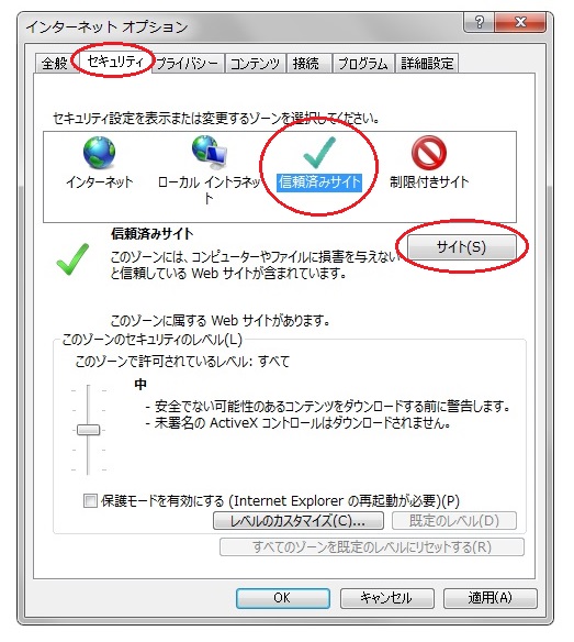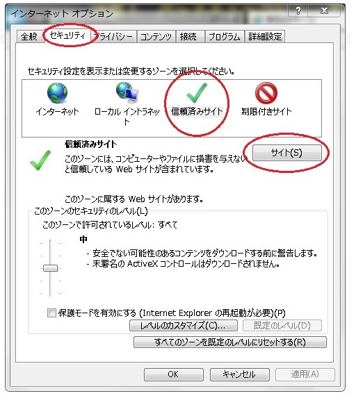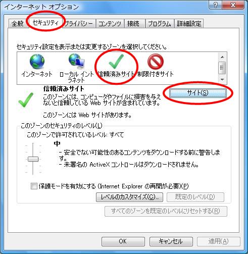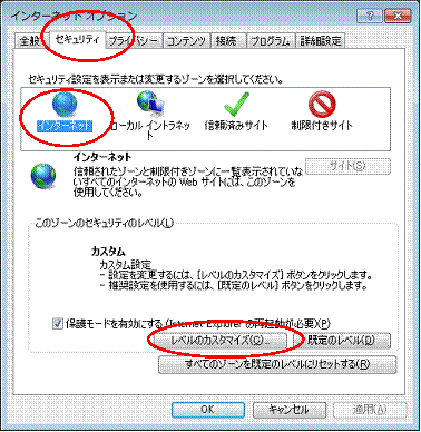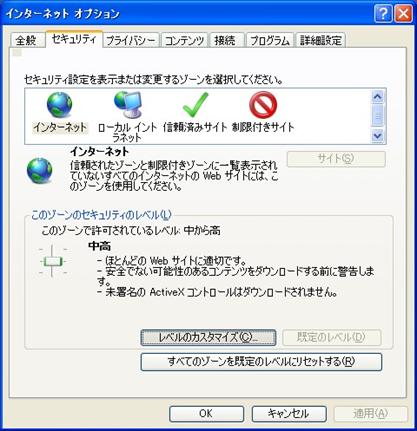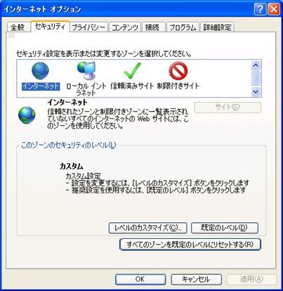 ・ 「インターネットオプション」のセキュリティタブを選択します。