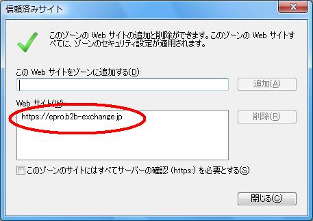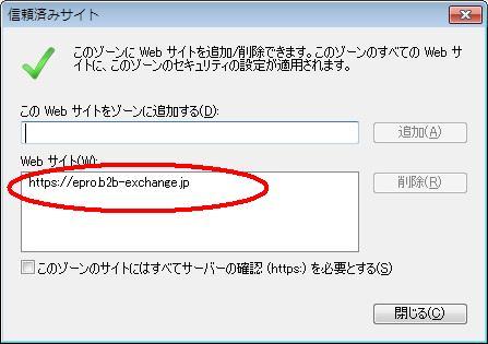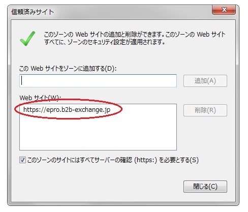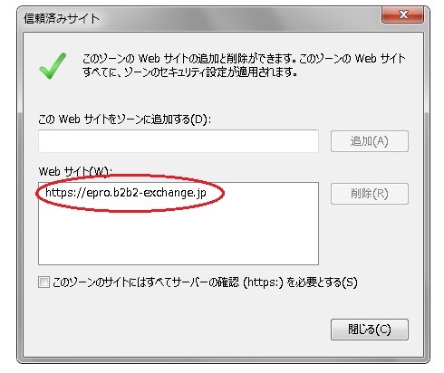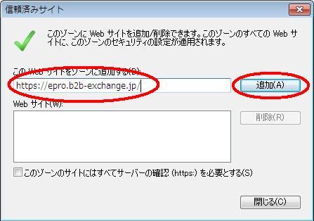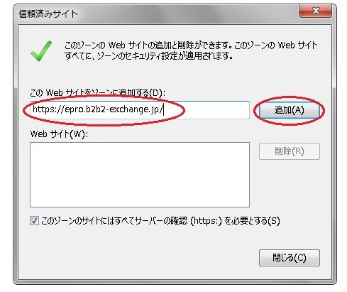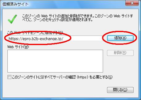 ・「信頼済みサイト」画面が表示されますので、 [ 次の Web サイトをゾーンに追加する (D)] の入力欄に ” https://epro.b2b-exchange.jp/ ” と入力し、 [ 追加 (A)] ボタンを押します。