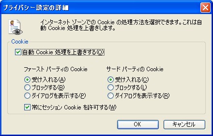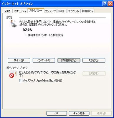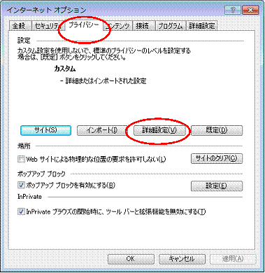1.<インターネットオプション>の[プライバシー]タブを選択し、『詳細設定』ボタンを