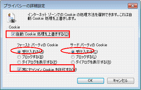 ファーストパーティのCookie →「受け入れる」にチェックします。