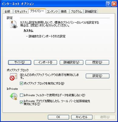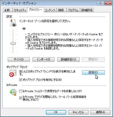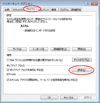 ・「プライバシー」タグの下段にある、ポップアップブロックの「設定」ボタンを押下してください。