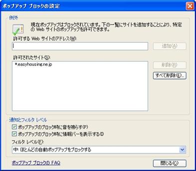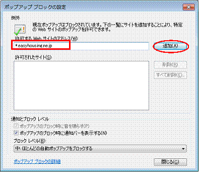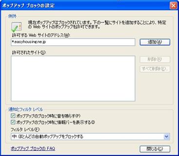 ・ポップアップブロックの設定画面が表示されるので、ここで「許可するWEB サイトのアドレス」に「*.easyhousing.ne.jp」と入力し追加ボタンを押下してください。