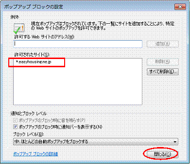 ・「許可されたサイト」に「*.easyhousing.ne.jp」が追加されたことを確認し、「閉じる」ボタンを押下してください。